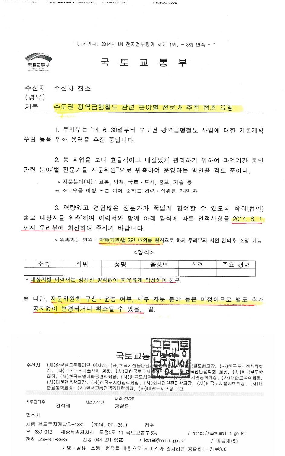 2. 국토교통부 철도투자개발과 로 부터, 2014년 6월 30일 부터 추진 중인 용역(수도권 광역급행철도 사업에 대한 기본계획 수립 등을 위한 용역) 의 과업기간 동안 보다 효율적이고 내실있는 관리를 위해 관련 분야별 전문가를 자문위원으로 위촉하여 운영하는 방안을 검토중이라 이에 따른 대상자 추천 요청이 있어 알려드리오니,