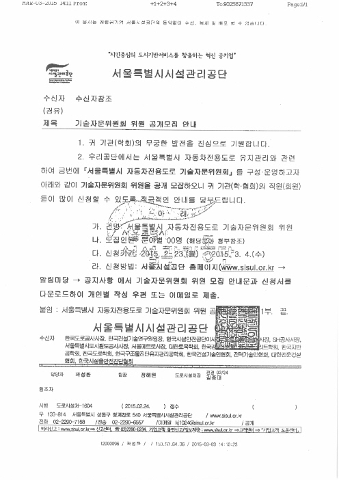 ▣ 서울특별시시설관리공단에서는 서울특별시 자동차전용도로 유지관리와 관련하여 금번에 "서울특별시 자동차전용도로 기술자문위원회"를 구성 및 운영하고자 하여 기술자문위원회 위원을 공개 모집하오니 적극적인 참여를 바랍니다.