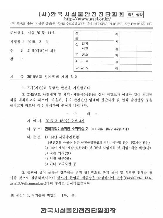 2. 2015년 사업계획 및 세입,세출예산(안)을 심의 의결코자 아래와 같이 정기총회를 개최하고자 하오며, 아울러, 우리 안전진단 업계의 현안사항 및 협회 발전방향 등을 논의코자 하오니 적극 참석하여 주시기 바랍니다.
