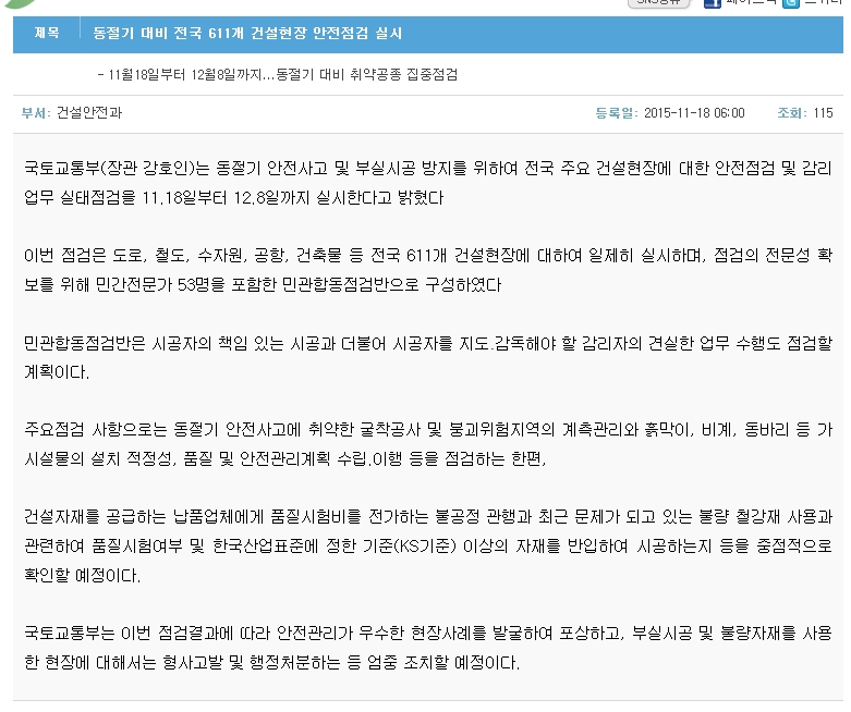 151118(석간) 동절기 대비 전국 611개 건설현장 안전점검 실시(건설안전과).pdf