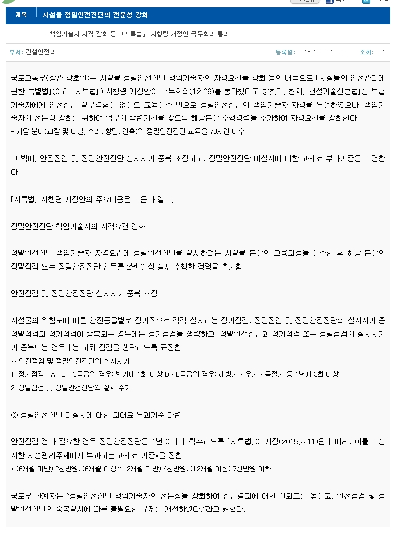 [국토교통부 보도자료] 시설물 정밀안전진단의 전문성 강화- 책임기술자 자격 강화 등 「시특법」 시행령 개정안 국무회의 통과