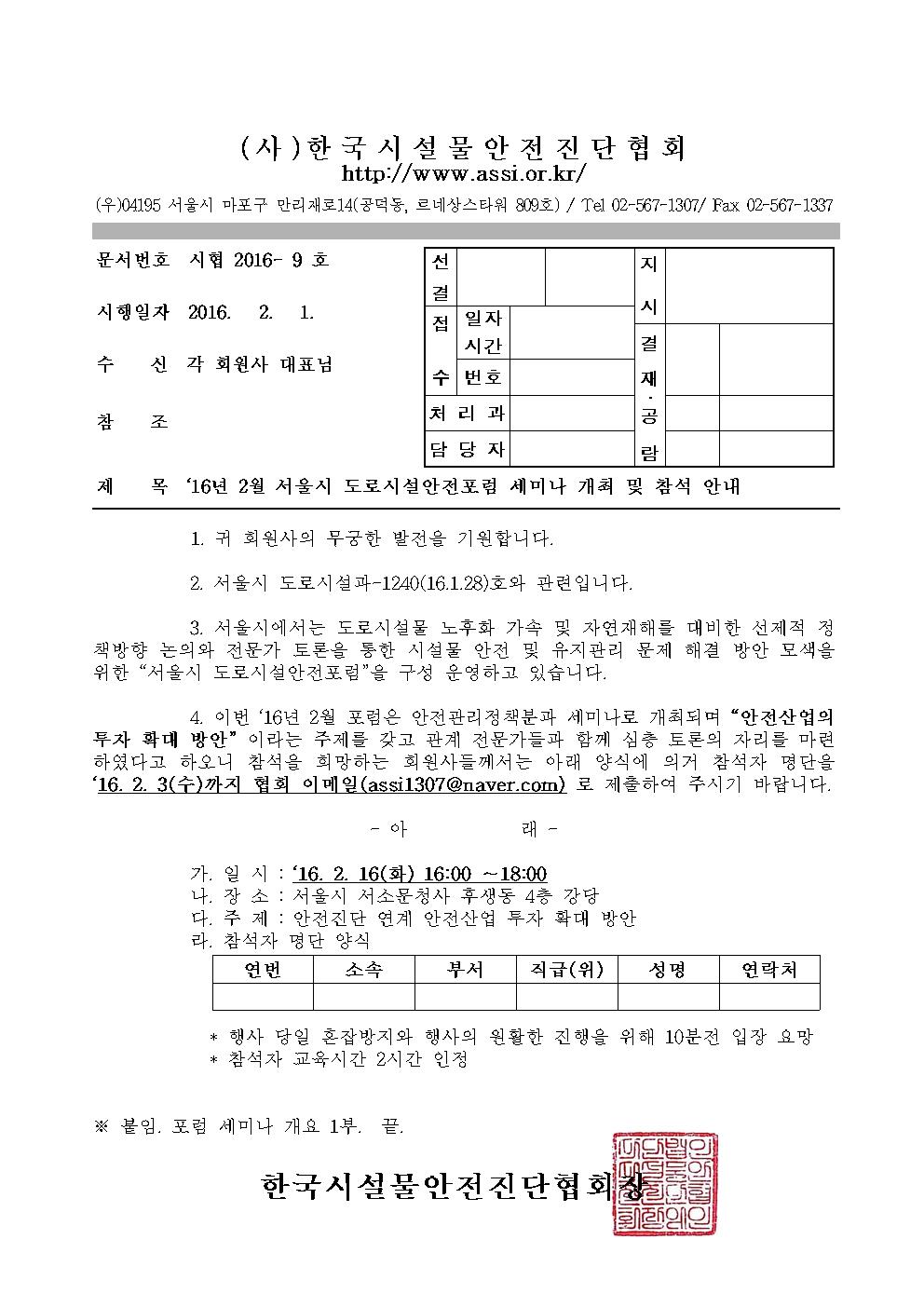 16년 2월 서울시 도로시설안전포럼 세미나 개최 및 참석안내