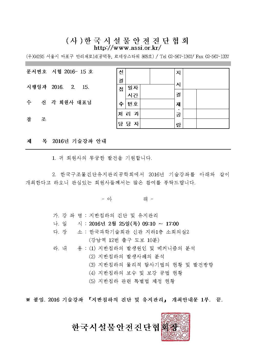 붙임1. 2016 기술강좌 『지반침하의 진단 및 유지관리』 개최안내문.hwp
