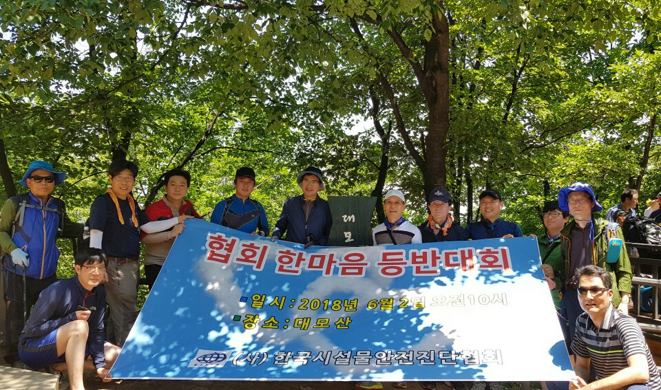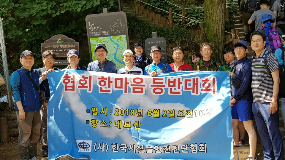 2018년 6월 2일 오전 10시 (사)한국시설물안전진단협회에서는 박주경 회장, 음성우수석부회장, 장정규 부회장, 설영민 이사, 정웅원 이사, 박용복 부장 및 관련회원사 12명이 제 1 회 협회 한마음 등반대회를 개최하였다. 첫 회 등반대회인 만큼 모인 각 임원님과 회원들간 협회 발전에 대하여 의견 등을 나누며, 화창한 날씨에 대모산에서 여유로운 협의를 하며, 등반을 진행 할 수 있었다.협회 발전을 위하여 협회 임원진 및 회원사의 대표 등이 2회 등반대회에서는 모두 참여하고, 협회는 회원사를 위한 단체인 만큼 많은 의견을 나누며, 한마음으로 뭉쳐 나가길 기원해본다.