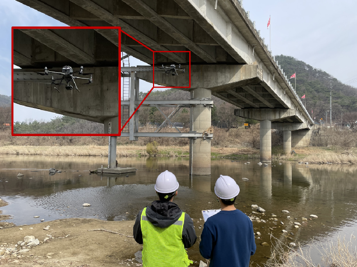 진화기술공사 관계자자 AI 드론을 활용해 강원도 옥산교 안전진단을 수행하고 있다. (제공=진화기술공사)